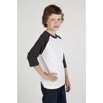 Crew neck, ¾ length raglan sleeves, curved tails